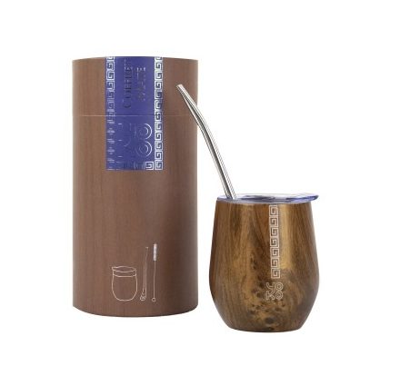 Coffret pour préparer et boire le maté : une calebasse en métal avec effet texture bois, une bombilla (paille filtrante) et un couvercle joint pour éviter d’en renverser partout, dans un joli coffret tubulaire.
